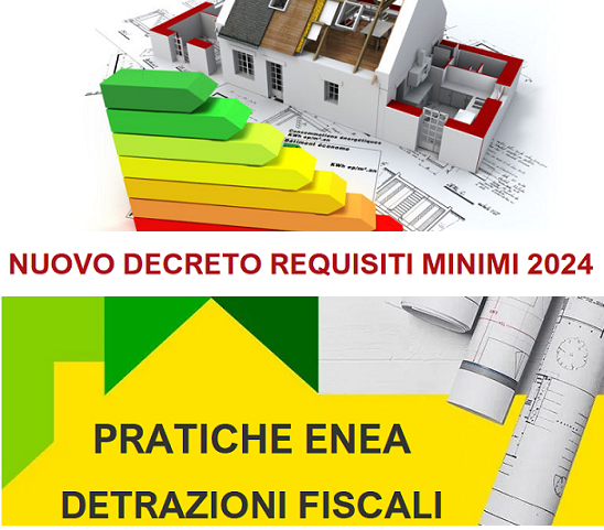 Verifica requisiti tecnici minimi degli edifici ai sensi del Decreto "26/06/2015" e del nuovo Decreto "Requisiti Minimi 2024". Asseverazione dei requisiti tecnici e congruità di spesa. Disbrigo pratiche Enea Ecobonus, Bonus Casa ed elettrodomestici per detrazioni fiscali 50-65%.